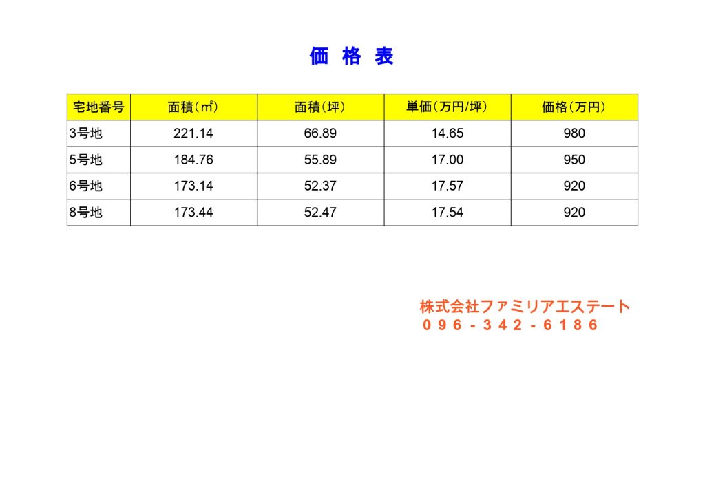 【価格変更しました】スーパーまで徒歩圏内の8区画分譲地! 土地/分譲地熊本市南区城南町下宮地(全8区画)価格920万円~980万円最寄り交通機関浜戸川橋バス停 徒歩10分所在地熊本市南区城南町下宮地土地面積173.14m2 (52.37坪)~221.14m2 (66.89坪)建ぺい率/容積率60% / 200%区画数 全8区画 / 販売4区画 地目宅地用途地域第一種住居地域接面道路分譲地内 公道 幅員約5m学校区隈庄小学校・下益城城南中学校建築条件建築条件なし引き渡し相談取引態様仲介備考・コメント・建築条件なし 詳細資料をダウンロードする